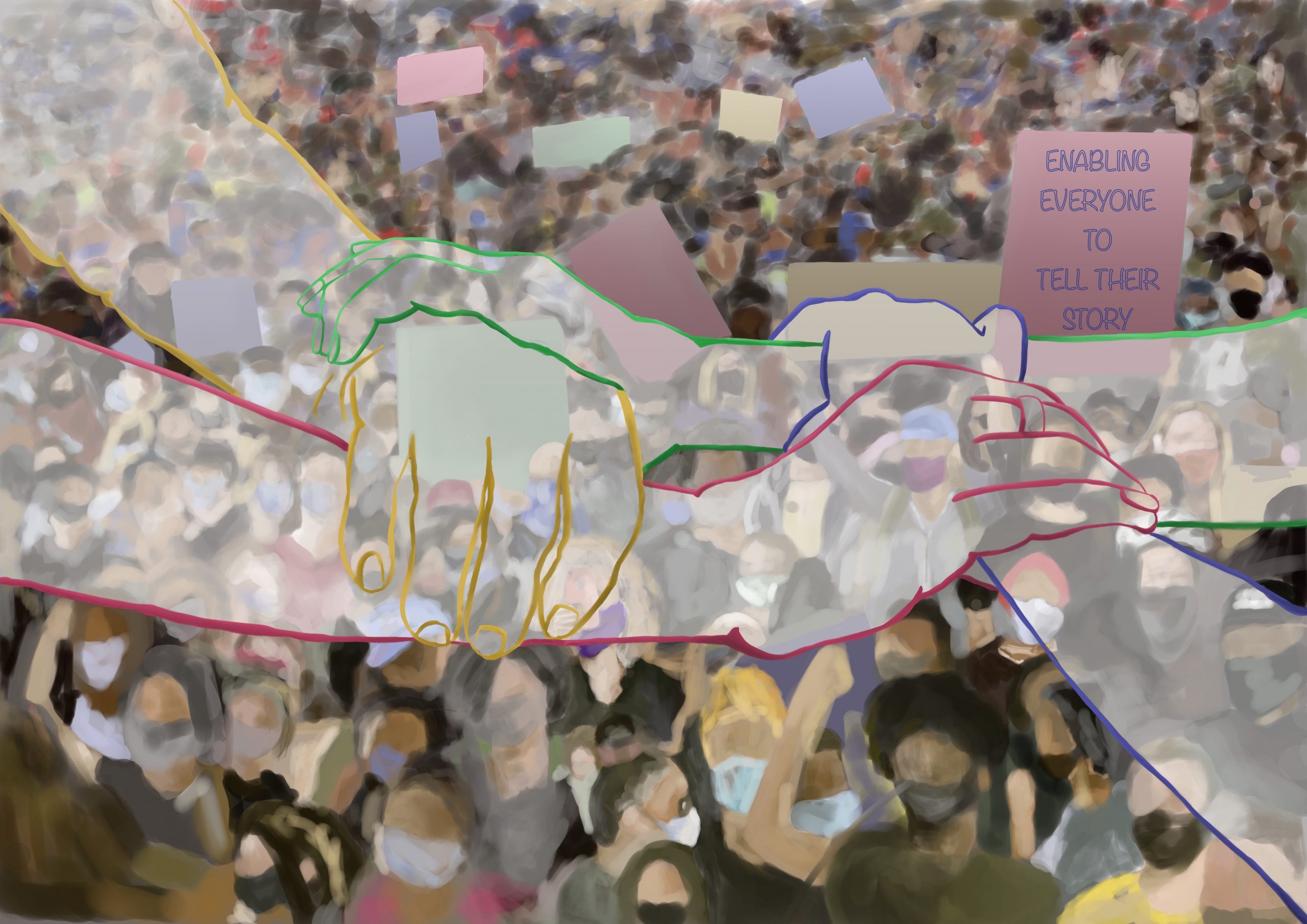 Yeonwoo Kim: “Globally, people gather at a specific location, date, and time carrying posters and banners in support of a cause. The united hands at the center of an obscure background of people exemplifies the gathering. My interpretation of the theme is that people experience damage due to their idiosyncrasy, specifically their unique physical features. Once we overlook such traits, we would become responsive and susceptible to becoming a unified group as we are all made of the same flesh and bones. In order to demonstrate how the group is unified by this similar aspect, I didn’t focus on only one individual on my piece. Instead, I obscurely created a group of people focusing on the holding of hands and how we are linked.”